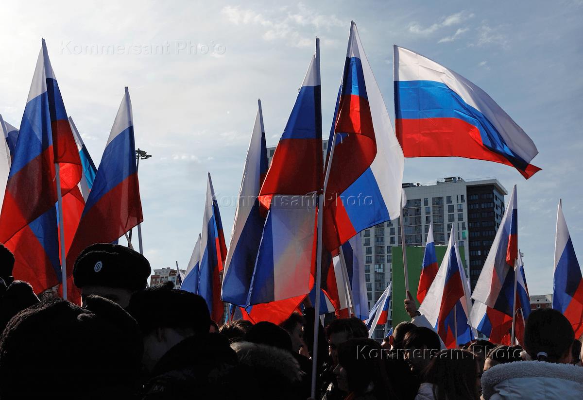 Митинг-концерт, посвященный 10-летнему юбилею со дня воссоединения Республики Крым с Россией "Россия, Крым, Севастополь. 10 лет в родной гавани" на стадионе "Екатеринбург-арена". Участники митинга-концерта с флажками российского триколора.