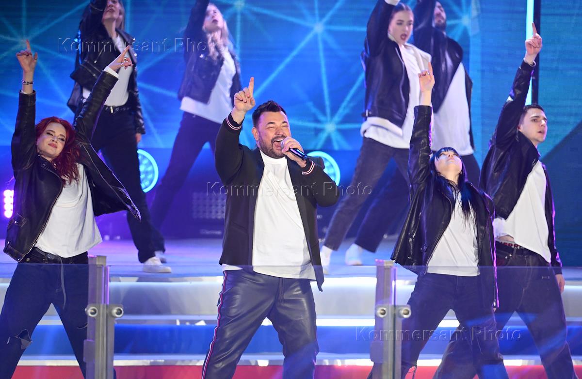 Rally-concert "10 years in the native harbor", dedicated to the 10th anniversary of the reunification of the Republic of Crimea with Russia on Red Square. Rap artist ST (Alexander Stepanov) (center) during a performance at the rally-concert.