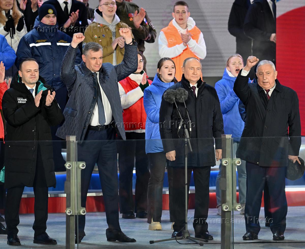Митинг-концерт "10 лет в родной гавани", посвященный 10-летнему юбилею к воссоединения Республики Крым с Россией на Красной площади. Президент России Владимир Путин (в центре), кандидаты от партий, участвующими в выборах президента России, кандидат от КПРФ, председатель комитета Государственной думы (ГД) России по развитию Дальнего Востока и Арктики Николай Харитонов (справа), кандидат от ЛДПР председатель партии Либерально-демократическая партия России (ЛДПР), руководитель фракции ЛДПР в ГД России Леонид Слуцкий (второй слева) и кандидат от партии "Новые люди", заместитель председателя ГД России Владислав Даванков (слева) во время митинга-концерта.