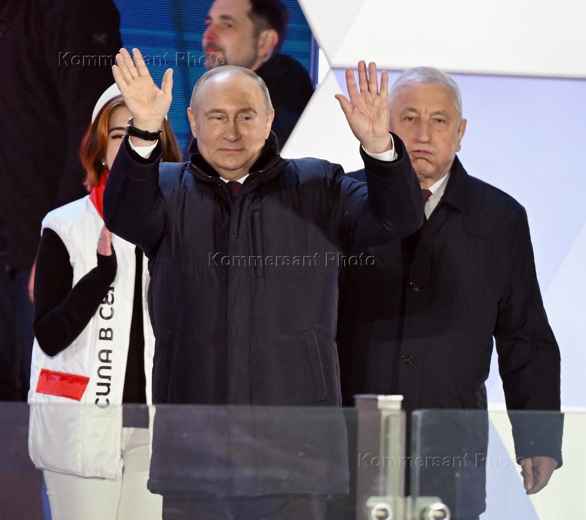 Митинг-концерт, посвященный 10-летнему юбилею к воссоединения Республики Крым с Россией на Красной площади. Президент России Владимир Путин (в центре) и кандидат от партий КПРФ, участвующий в выборах президента России, председатель комитета Государственной думы (ГД) России по развитию Дальнего Востока и Арктики Николай Харитонов (справа) на митинге-концерте.