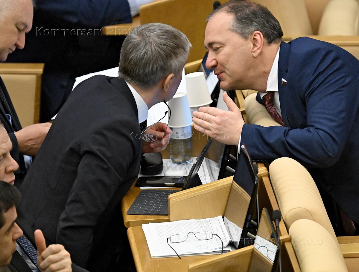 Plenary meeting of the State Duma of Russia. Chairman of the Russian State Duma Committee on Security and Anti-Corruption Vasily Piskarev (center) and Chairman of the Russian State Duma Committee on Transport and Transport Infrastructure Development Evgeny Moskvichev (right) during the meeting.