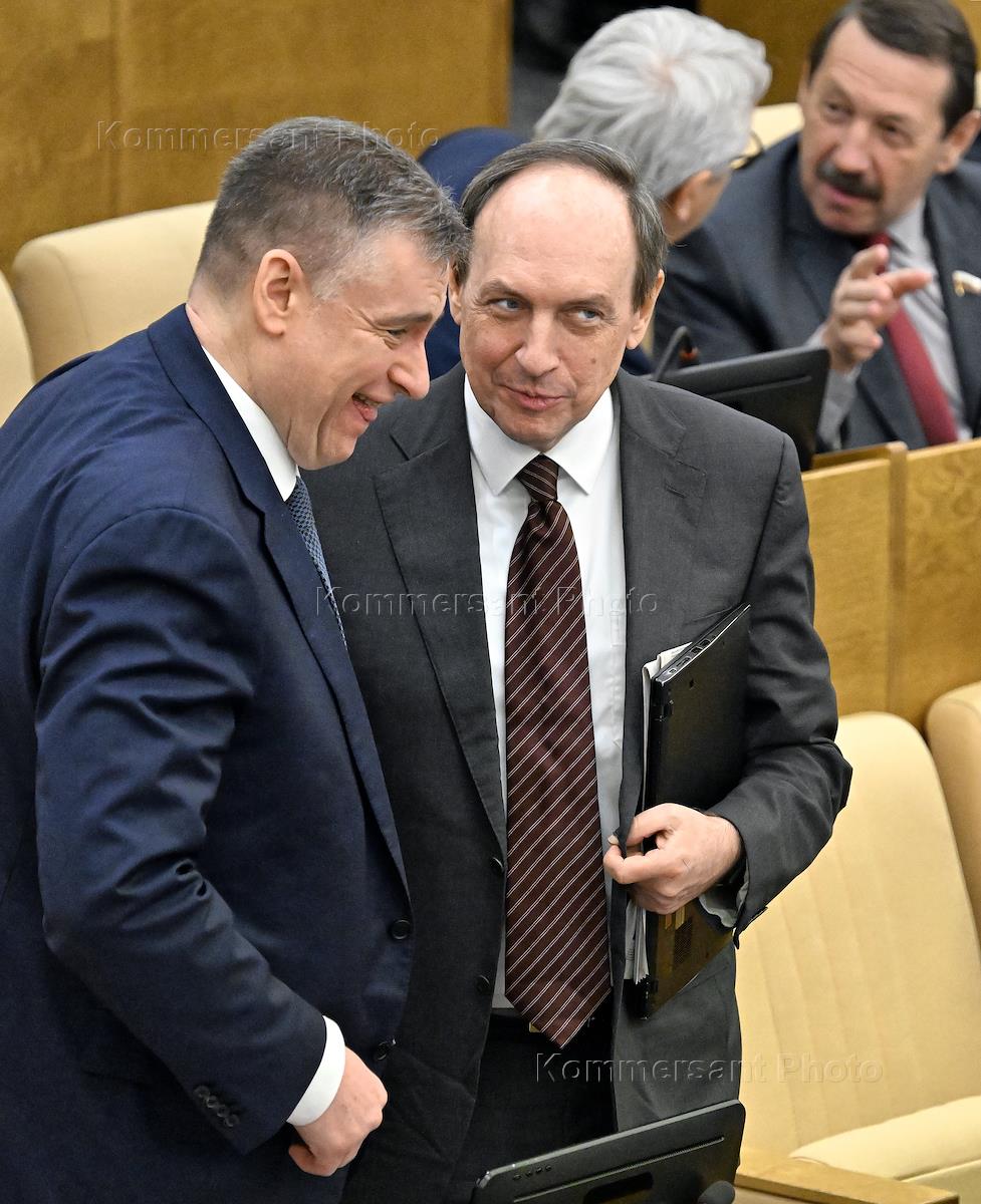 Пленарное заседание Государственной думы (ГД) России. Председатель комитета ГД России по безопасности и противодействию коррупции Василий Пискарев (в центре) и председатель комитета ГД России по транспорту и развитию транспортной инфраструктуры Евгений Москвичев (справа) во время заседания.