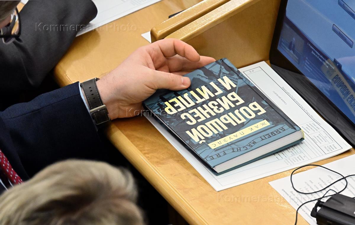 Plenary meeting of the State Duma of Russia. The book "Big Business and Hitler" by Jacques R. Pauwels is on the deputy's desk. Genre photography.