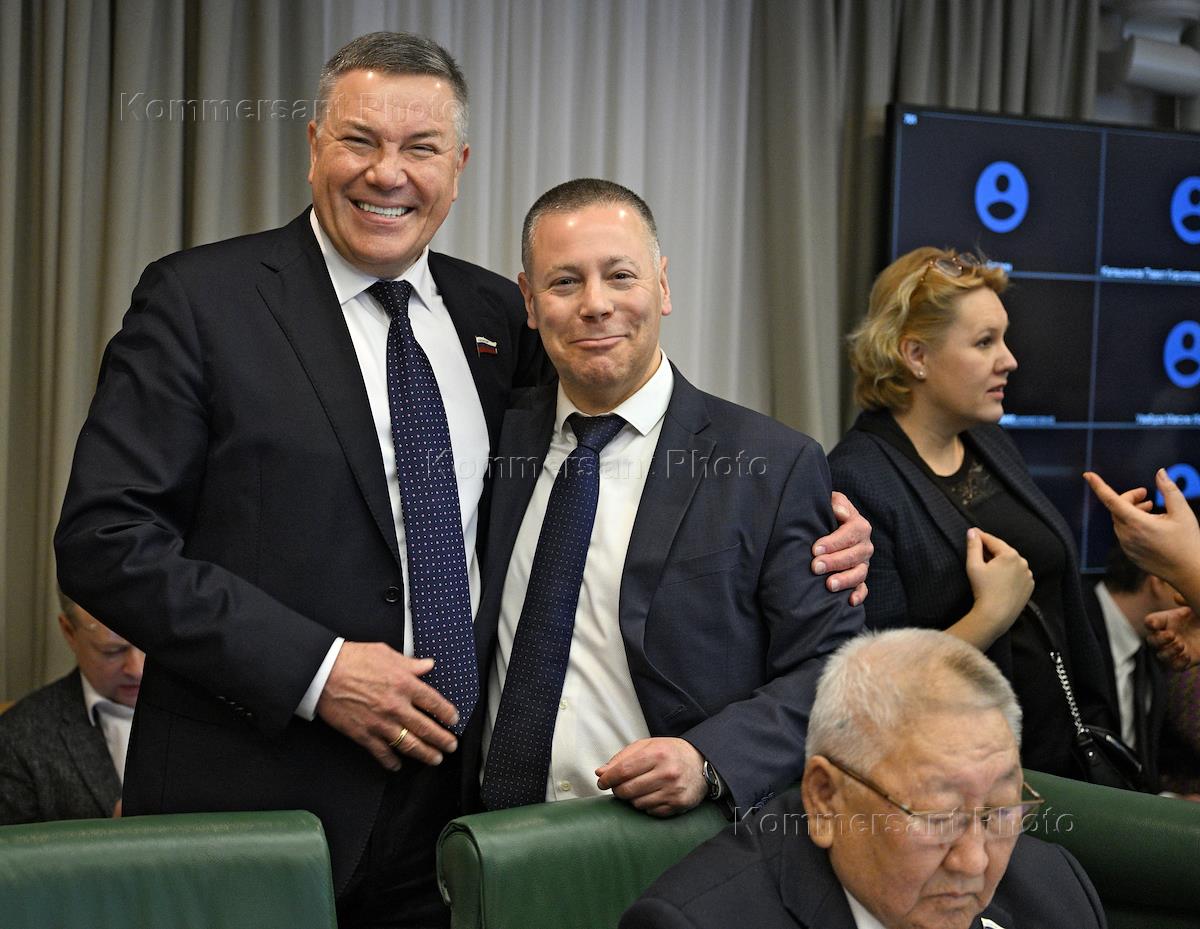 Дни Ярославской области в Совете Федерации (СФ) России. Заседание комитета СФ России по аграрно-продовольственной политике и природопользованию "Актуальные направления деятельности в сфере природопользования в Ярославской области" в СФ России. Губернатор Ярославской области Михаил Евраев (слева) и представитель в СФ России от законодательного (представительного) органа государственной власти Московской области, председатель комитета СФ России по аграрно-продовольственной политике и природопользованию Александр Двойных (в центре) во время заседания.