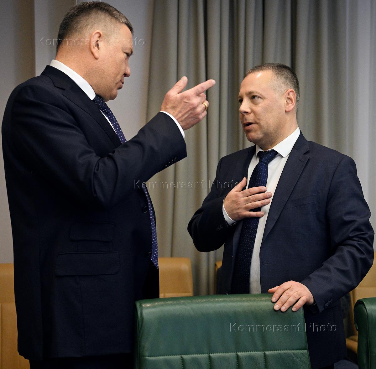 Дни Ярославской области в Совете Федерации (СФ) России. Заседание комитета СФ России по аграрно-продовольственной политике и природопользованию "Актуальные направления деятельности в сфере природопользования в Ярославской области" в СФ России. Губернатор Ярославской области Михаил Евраев (справа) и представитель в СФ России от исполнительной власти Вологодской области, первый заместитель председателя комитета СФ России по аграрно-продовольственной политике и природопользованию Олег Кувшинников (слева) перед началом заседания.