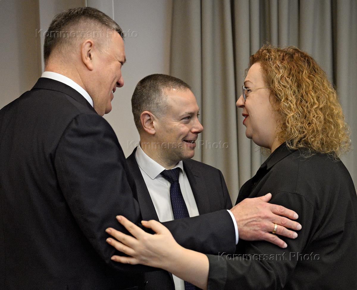 Дни Ярославской области в Совете Федерации (СФ) России. Заседание комитета СФ России по аграрно-продовольственной политике и природопользованию "Актуальные направления деятельности в сфере природопользования в Ярославской области" в СФ России. Справа налево: представитель исполнительного органа государственной власти Республики Коми Ольга Епифанова, губернатор Ярославской области Михаил Евраев и представитель в СФ России от исполнительной власти Вологодской области, первый заместитель председателя комитета СФ России по аграрно-продовольственной политике и природопользованию Олег Кувшинников перед началом заседания.