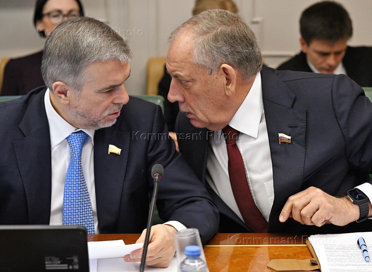 Days of the Yaroslavl region in the Federation Council of Russia. Meeting of the Committee of the Federation Council of Russia on agrarian and food policy and environmental management "Current areas of activity in the field of environmental management in the Yaroslavl region" in the Federation Council of Russia. Representative from the legislative (representative) body of state power of the Republic of Ingushetia, deputy chairman of the Federation Council of Russia committee on agrarian and food policy and environmental management Belan Khamchiev (left) and representative to the Federation Council from the executive body of state power of the Novgorod region, first deputy chairman of the Federation Council of Russia committee on agrarian food policy and environmental management Sergei Mitin before the start of the meeting.