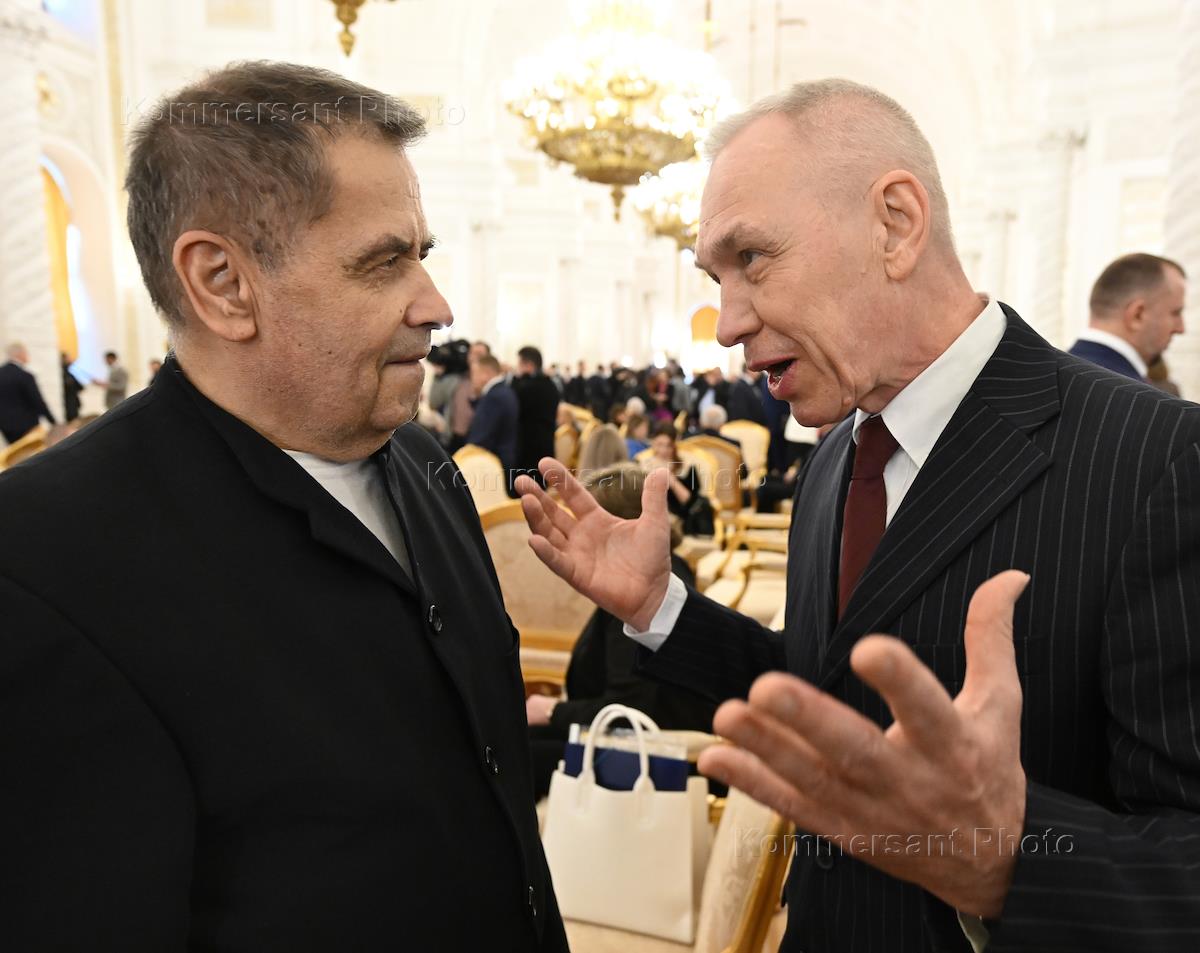 Встреча президента России Владимира Путина с доверенными лицами, поддержавшими его на выборах президента России, в Андреевском зале Большого Кремлевского дворца. Председатель Союза художников России Андрей Ковальчук (слева) и президент Национального исследовательского центра (НИЦ) "Курчатовский институт" Михаил Ковальчук (в центре) перед началом встречи.