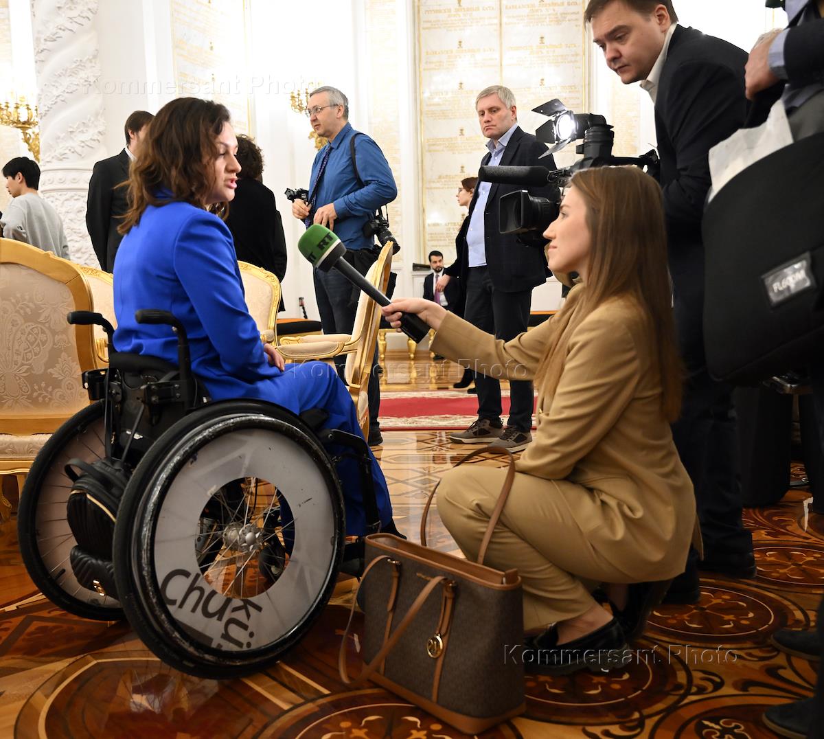 Встреча президента России Владимира Путина с доверенными лицами, поддержавшими его на выборах президента России, в Андреевском зале Большого Кремлевского дворца. Телеведущая Юлия Барановская (справа) перед началом встречи.