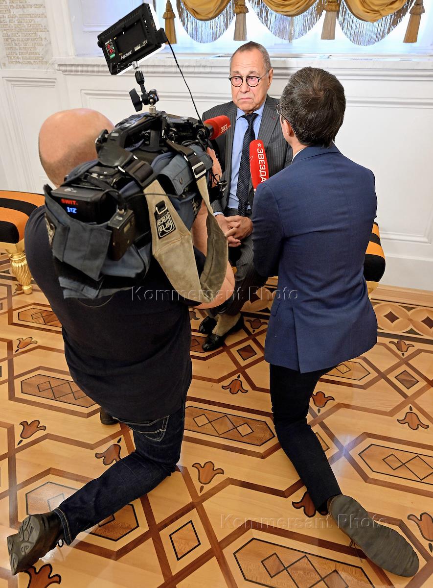 Встреча президента России Владимира Путина с доверенными лицами, поддержавшими его на выборах президента России, прошла в Андреевском зале Большого Кремлевского дворца. Режиссер Андрей Кончаловский (слева) и художественный руководитель, главный дирижер Государственного симфонического оркестра "Новая Россия" Юрий Башмет (справа) перед началом встречи.
