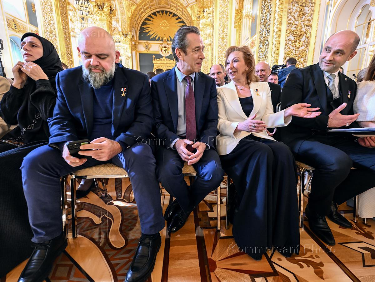 Встреча президента России Владимира Путина с доверенными лицами, поддержавшими его на выборах президента России, прошла в Андреевском зале Большого Кремлевского дворца. Слева направо: мать погибшего Героя России Нурмагомеда Гаджимагомедова Сапижат Мазаева, председатель Комиссии Генерального совета "Единой России" по здравоохранению, директор ГБУЗ города Москвы "Московский многопрофильный клинический центр "Коммунарка" Денис Проценко, председатель Союза театральных деятелей, художественный руководитель Московского театра Олега Табакова Владимир Машков, главный врач ГБУ здравоохранения города Москвы "Городская клиническая больница №52 Департамента здравоохранения города Москвы" Марьяна Лысенко и председателя Народного Совета Донецкой Народной Республики Андрей Жога перед началом встречи.