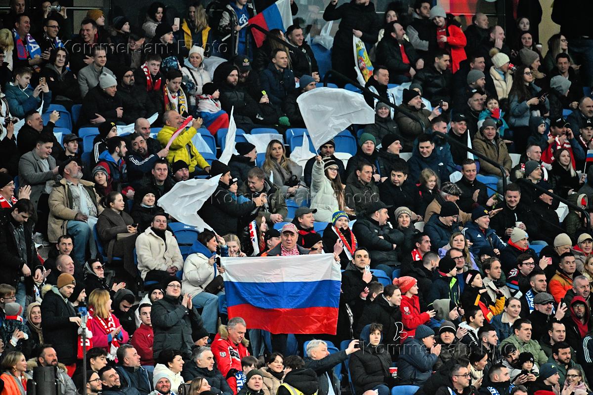 Товарищеский матч по футболу национальной сборной России с командой Сербии на стадионе "ВТБ Арена - Центральный стадион Динамо им. Льва Яшина". Болельщики сборной команды России на трибуне стадиона.
