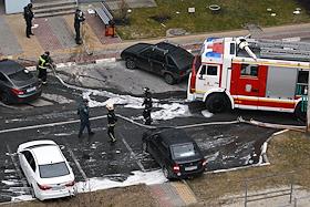 Ситуация в Белгороде. Последствия обстрела ВСУ. Сгоревшие автомобили во многоэтажного дворе жилого дома. Сотрудники правоохранительных служб и пожарной службы МЧС на месте происшествия.