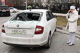 Ситуация в Белгороде. Последствия обстрела ВСУ. Женщина медик у поврежденного результате обстрела автомобиля во дворе многоэтажного жилого дома.