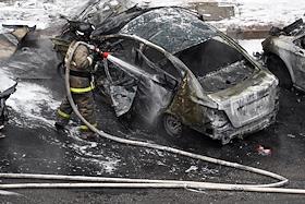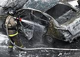Ситуация в Белгороде. Последствия обстрела ВСУ. Сотрудник пожарной службы МЧС туши сгоревший автомобиль во многоэтажного дворе жилого дома.