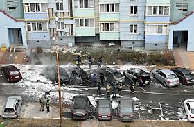 Ситуация в Белгороде. Последствия обстрела ВСУ. Поврежденный результате обстрела автомобиль во дворе многоэтажного жилого дома.