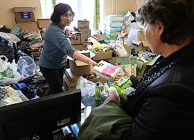 Жители Белгорода и Грайворонского городского округа, вынужденно оставившие свои дома из-за обстрелов, в пункте временного размещения в Старом Осколе. Место раздачи санитарно-гигиенических средств.