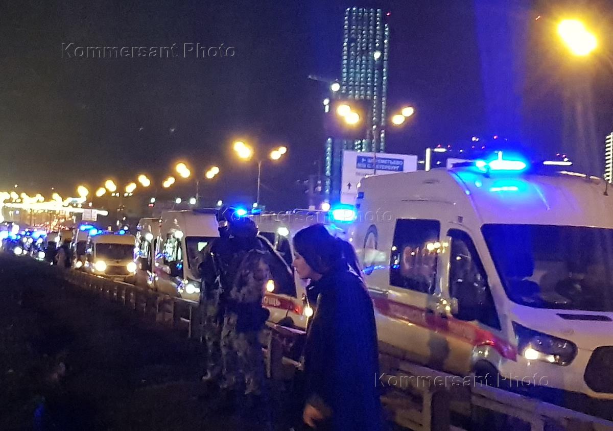 Теракт в концертном зале "Крокус Сити Холл" во время концерта группы "Пикник". От двух до пяти человек напали на концертный зал, произошла стрельба и пожар в здании зала. Автомобили скорой медицинской помощи на площади у "Крокус Сити Холл".