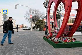 Ситуация в Белгороде в период обеспечения мер безопасности и эвакуации жителей. Жанровая фотография. Стихийный мемориал на улице в память о погибших в результате теракта в концерном зале "Крокус Сити Холл" 22 марта 2024 года.