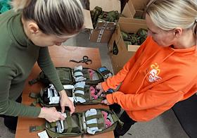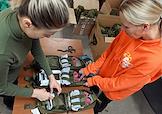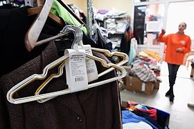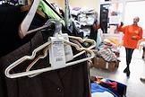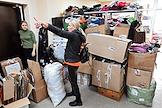 Ситуация в Белгороде в период обеспечения мер безопасности и эвакуации жителей. Жанровая фотография. Автономная некоммерческая организация "Центр помощи Юлии Немчиновой". Председатель Центра Юлия Немчинова (справа) у стеллажа с одеждой для пострадавших.