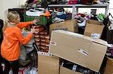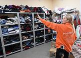 Ситуация в Белгороде в период обеспечения мер безопасности и эвакуации жителей. Жанровая фотография. Автономная некоммерческая организация "Центр помощи Юлии Немчиновой". Председатель Центра Юлия Немчинова (справа) у стеллажа с одеждой для пострадавших.