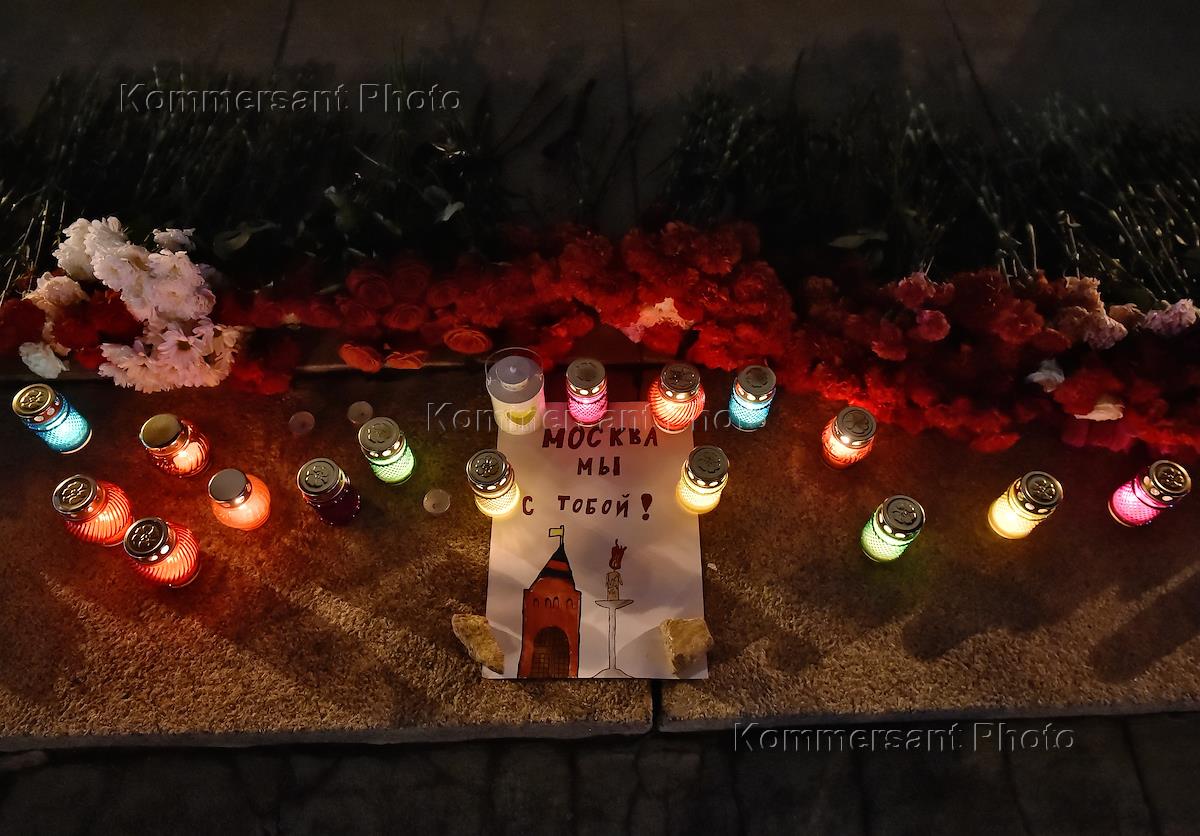 Акция памяти жертв теракта в подмосковном концертном зале "Крокус Сити Холл" в Новосибирске. Свечи и рисунок с надписью "Москва мы с тобой" у стихийного мемориала рядом с баннером с изображением свечи и надписью "Скорбим. 22.03.2024".