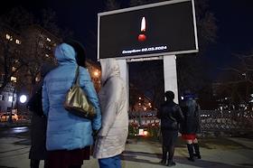 Акция памяти жертв теракта в подмосковном концертном зале "Крокус Сити Холл" в Новосибирске. Люди у стихийного мемориала рядом с баннером с изображением свечи и надписью "Скорбим. 22.03.2024".