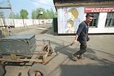 Заключенный колонии для осужденных сотрудников МВД везет тележку в мастерскую.