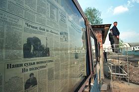 Информационный стенд с газетами на территории колонии для осужденных сотрудников МВД.