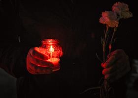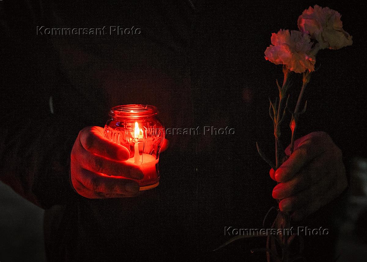 Акция движения "Вместе" в память о погибших с терактом в подмосковном концертном зале "Крокус Сити Холл". Стихийный мемориал у посольства России в Ереване. Жанровая фотография. Зажженная свеча и цветы у мемориала.