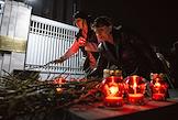 Акция движения "Вместе" в память о погибших с терактом в подмосковном концертном зале "Крокус Сити Холл". Стихийный мемориал у посольства России в Ереване. Жанровая фотография. Зажженные свечи и цветы у мемориала.