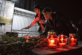 Акция движения "Вместе" в память о погибших с терактом в подмосковном концертном зале "Крокус Сити Холл". Стихийный мемориал у посольства России в Ереване. Надпись выложенная зажженными свечами "Скорбим" у мемориала.