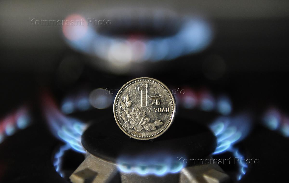 Жанровая фотография. Монеты достоинством один юань и один рубль на горелке газовой плиты.