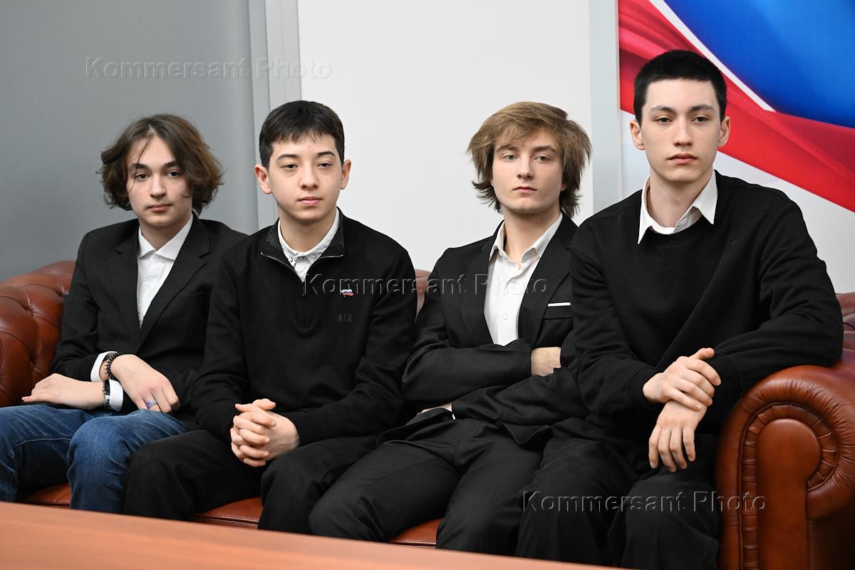 Заседание Комитета Государственной думы (ГД) России по защите семьи, вопросам отцовства, материнства и детства. Церемония награждения участников спасения посетителей концертного зала "Крокус Сити Холл" во время теракта 22 марта 2024 года. Слева направо: ученик школы № 1564 Артемий Филимонов, ученик школы № 19 Ислам Халилов, школьник Никита Иванов и ученик школы № 1191 Александр Журик перед началом церемонии.