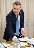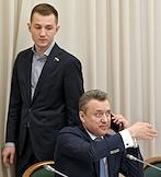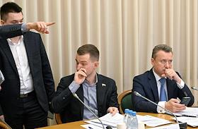 Совместное заседание комитета Государственной думы (ГД) России по безопасности и противодействию коррупции и комитета ГД России по молодежной политике на тему "Противодействие вовлечению молодежи в преступные сообщества и меры по ограничению влияния деструктивного контента" в ГД России. Председатель комитета ГД России по молодежной политике Артем Метелев (в центре) и заместитель председателя комитета ГД России по безопасности и противодействию коррупции Анатолий Выборный (справа) во время заседания.
