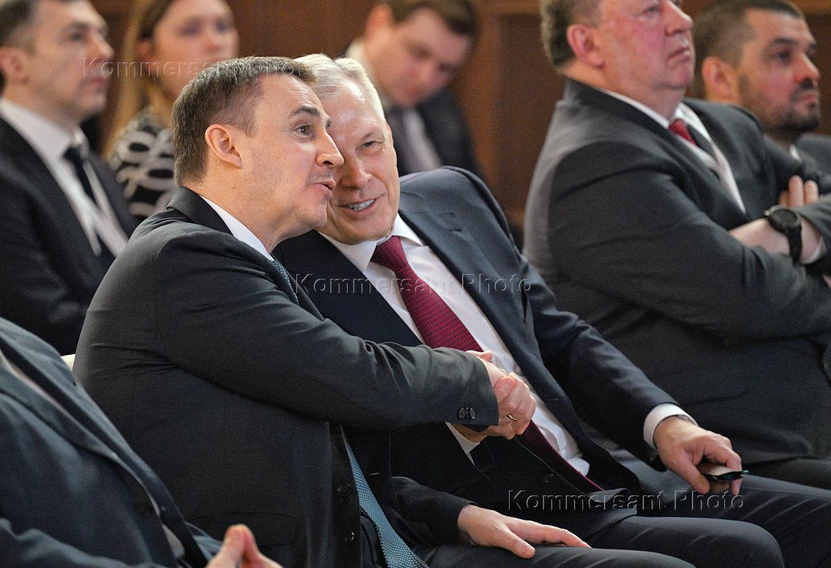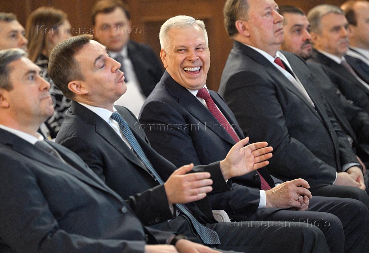 Заседание итоговой коллегии Федеральной службы России по ветеринарному и фитосанитарному надзору (Россельхознадзор). Министр сельского хозяйства России Дмитрий Патрушев (слева) и руководитель Россельхознадзора Сергей Данкверт (в центре) на заседании.