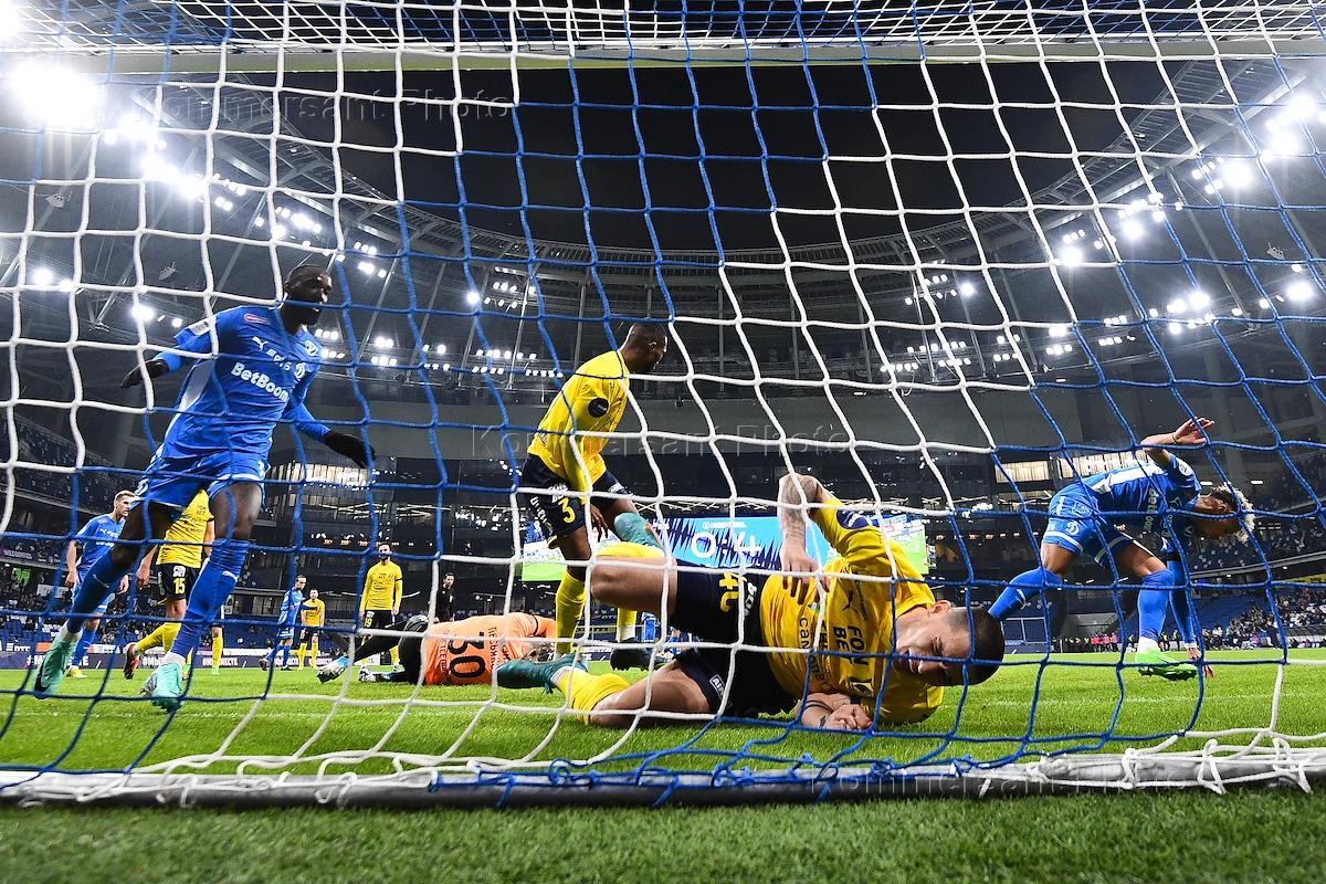 Российская Премьер-Лига (РПЛ). МИР - Чемпионат России по футболу 2023/2024. 22-й тур. Матч между командами "Динамо" (Москва) - "Ростов" (Ростов-на-Дону) на стадионе "ВТБ Арена". Игрок команды "Ростов" Егор Голенков (справа) во время матча.