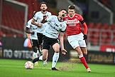 Российская Премьер-Лига (РПЛ). МИР - Чемпионат России по футболу 2023/2024. 22-й тур. Матч между командами "Спартак" (Москва) - "Урал" (Екатеринбург) на стадионе "Лукойл Арена". Игрок команды "Спартак" Тео Бонгонда (справа) и игрок команды "Урал" Итало (слева) во время матча.