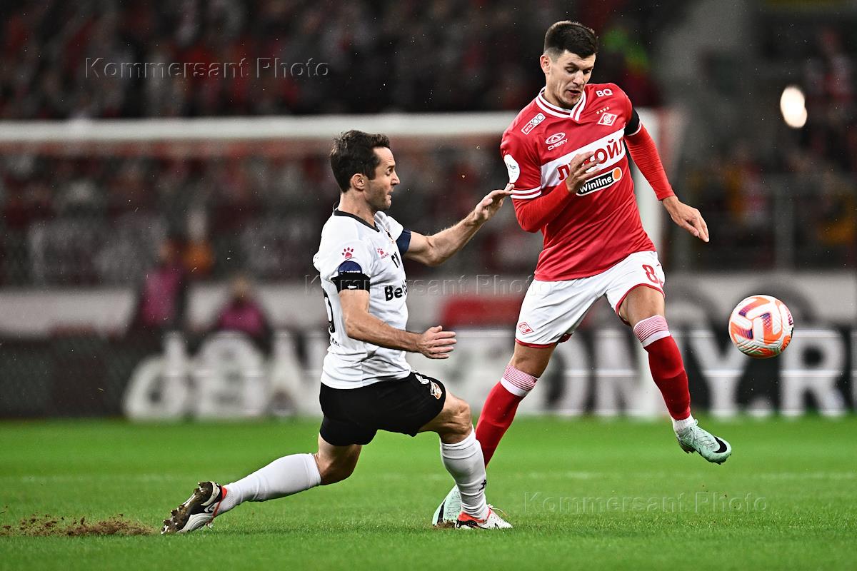 Российская Премьер-Лига (РПЛ). МИР - Чемпионат России по футболу 2023/2024. 22-й тур. Матч между командами "Спартак" (Москва) - "Урал" (Екатеринбург) на стадионе "Лукойл Арена". Игрок команды "Урал" Силвие Бегич (в центре) и игрок команды "Спартак" Александр Соболев (справа) во время матча.