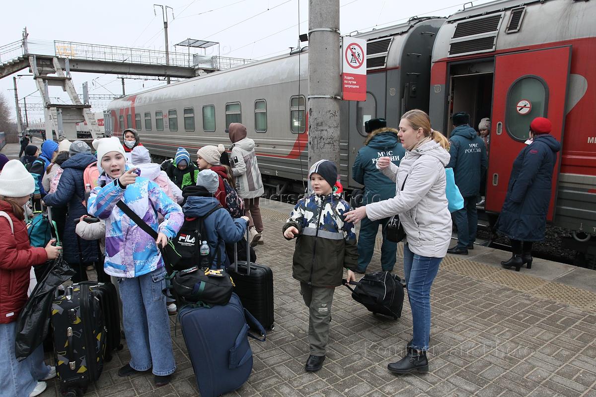 Прибытие учеников младших классов, эвакуированных из Белгорода, в лагерь отдыха "Лазурный".