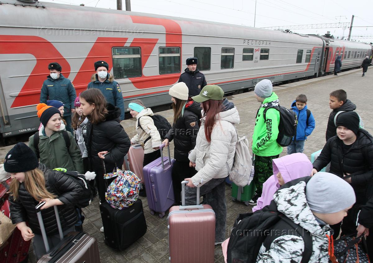 Прибытие школьников, эвакуированных из Белгорода, в лагерь отдыха "Лазурный". Сбор детей на станции.