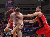 Единая лига ВТБ по баскетболу. Матч между командами ЦСКА (Москва) - "Локомотив-Кубань" (Краснодар) на спортивной арене "Мегаспорт". Игрок команды ЦСКА Ливио Жан-Шарль (слева) и игрок команды "Локомотив-Кубань" Андрей Мартюк (справа) во время матча.