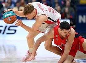 Единая лига ВТБ по баскетболу. Матч между командами ЦСКА (Москва) - "Локомотив-Кубань" (Краснодар) на спортивной арене "Мегаспорт". Игрок команды ЦСКА Семен Антонов (справа) и игрок команды "Локомотив-Кубань" Владислав Емченко (слева) во время матча.