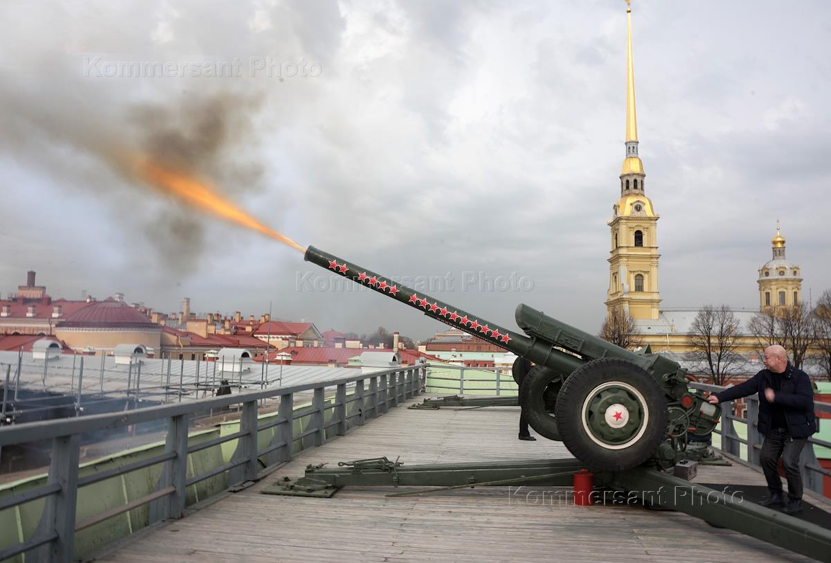 Церемония открытия XX "Смешного фестиваля" под руководством Клоун-мим-театра "Мимигранты". "Король фестиваля", актер Сергей Селин производит полуденный выстрел из пушки Петропавловской крепости.
