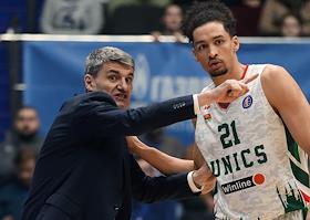 Единая лига ВТБ по баскетболу. Матч между командами "Зенит" (Санкт-Петербург) - УНИКС (Казань) в концертно-спортивном комплексе (КСК) "Арена". Главный тренер команды УНИКС Велимир Перасович (слева) и игрок команды УНИКС Исмаэль Бако (справа) во время матча.