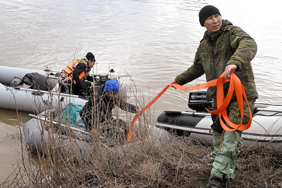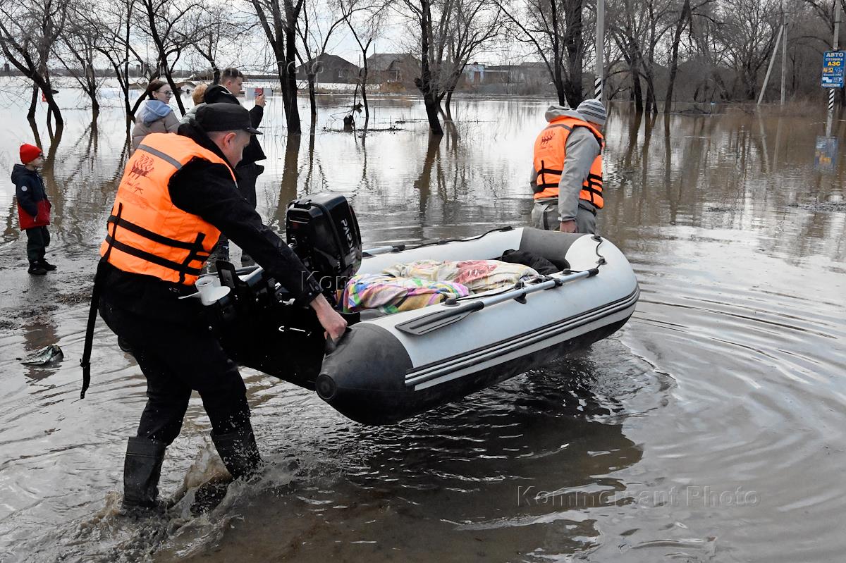 Последствия наводнения в городе Орске. Жанровая фотография. Сотрудники МЧС во время эвакуации местных жителей из зоны затопления.