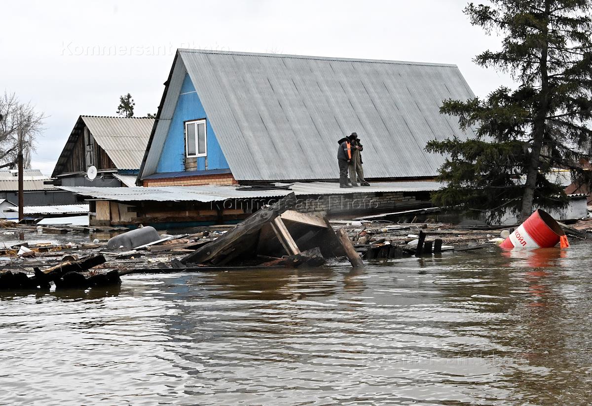 Consequences of flooding in the city of Orsk after a dam break on the Ural River. Genre photography. Flooded private residential building.