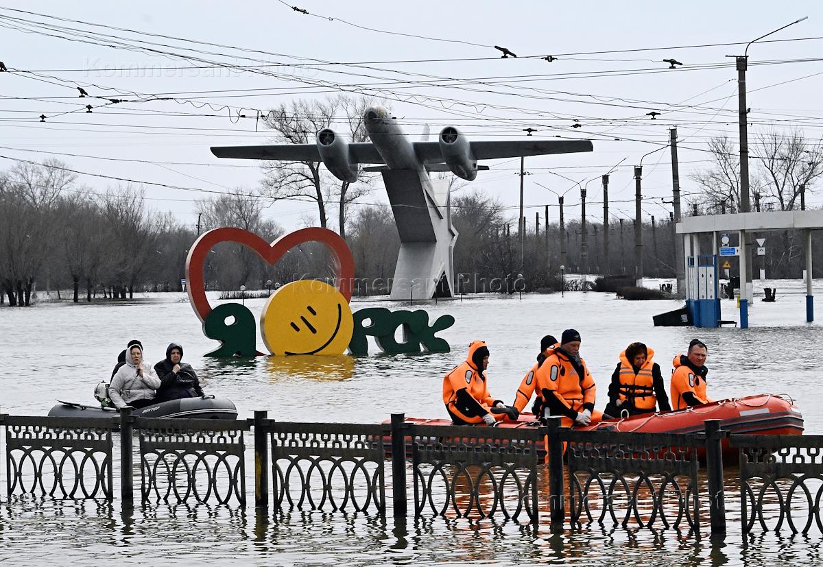 Последствия прорыва дамбы в Орске. Жанровая фотография. Сотрудники МЧС во время эвакуации местных жителей из зоны затопления. Памятник самолету Ил-28.