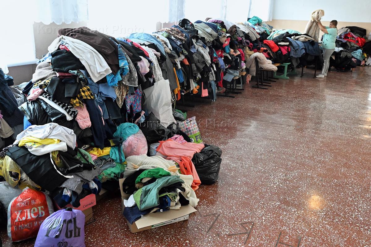 Consequences of a dam break in Orsk. Unloading humanitarian aid at a temporary accommodation center for victims of a dam break.