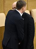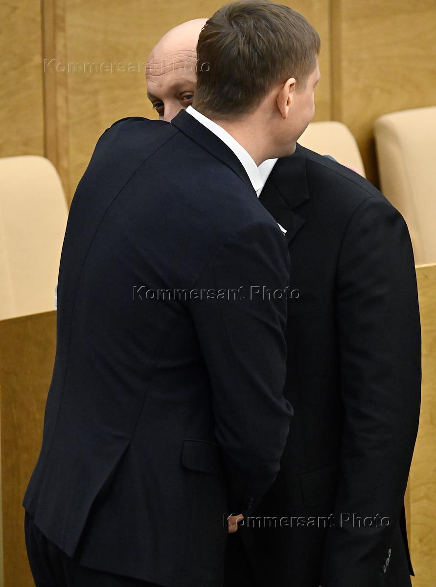Пленарное заседание Государственной думы (ГД) России. Председатель комитета ГД России по региональной политике и местному самоуправлению Алексей Диденко (слева) и первый заместитель председателя комитета ГД России по безопасности и противодействию коррупции Андрей Луговой во время заседания.